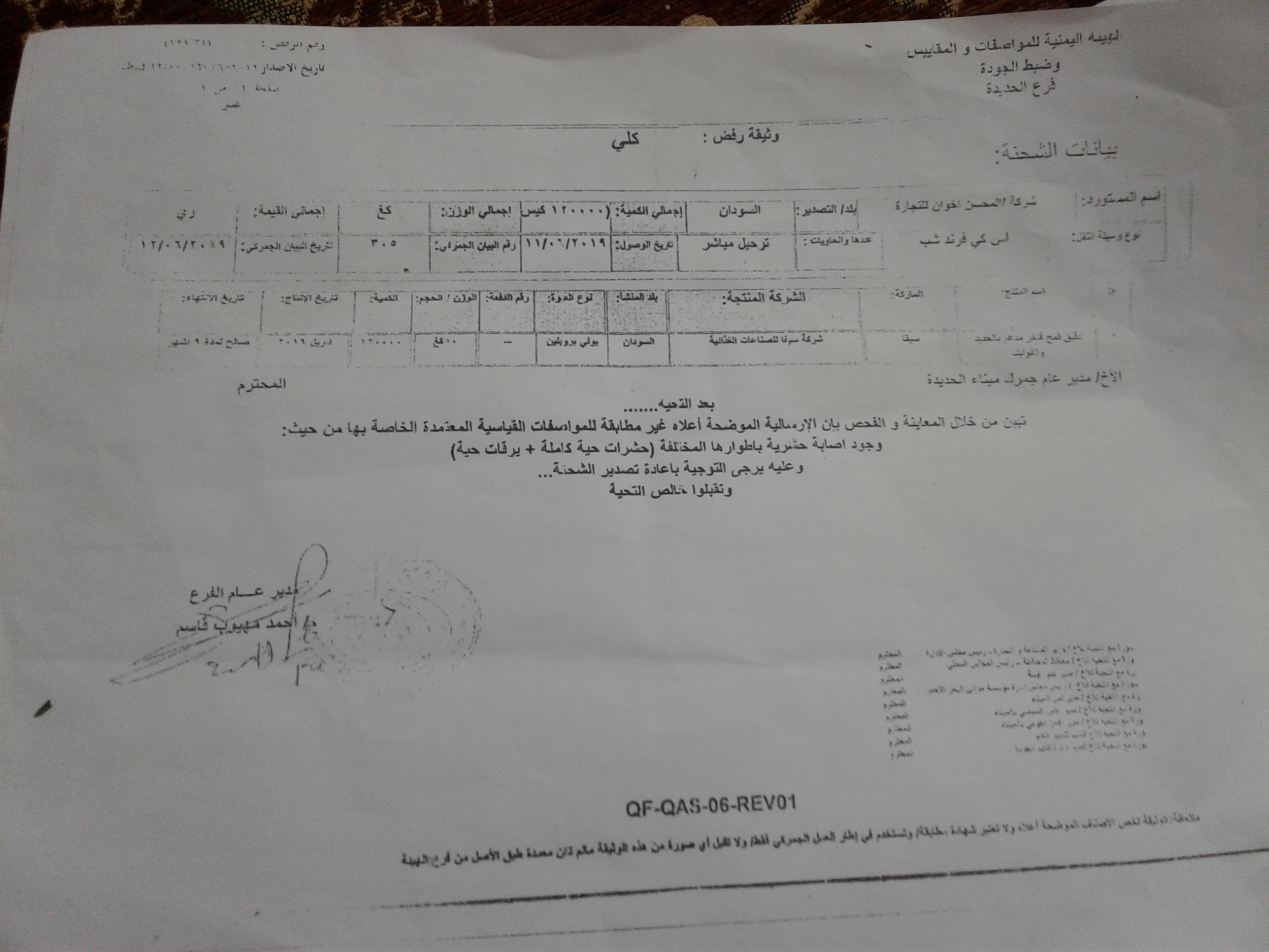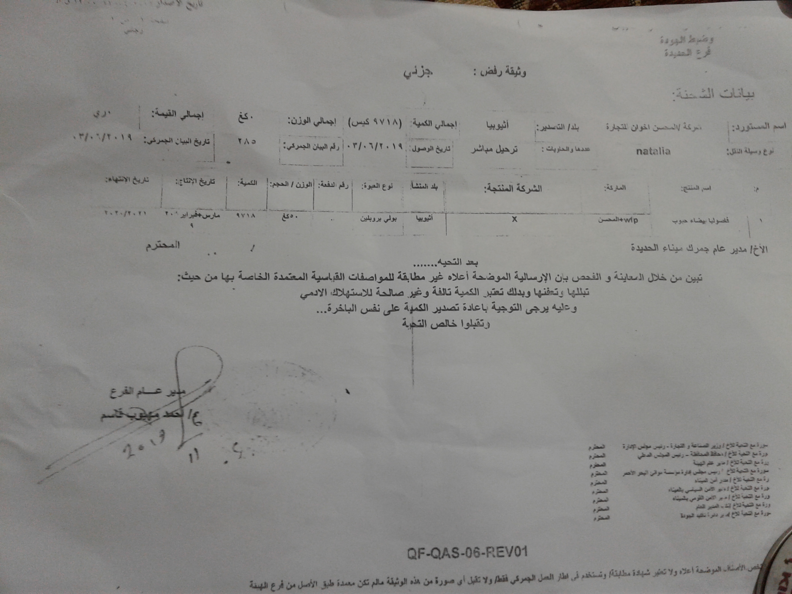 في الثالث من شهر يونيو الجاري عادت هيئة المواصفات والمقاييس الباخرة nataliaالتي تحمل أكثر من 9700 كيس من الفاصوليا البيضاء تتبع منظمة الغذاء العالمي تم استيرادها من اثيوبيا عن طريق الشريك المحلي شركة المحسن للتجارة لعدم صلاحيتها للاستهلاك البشري لتعفنها.