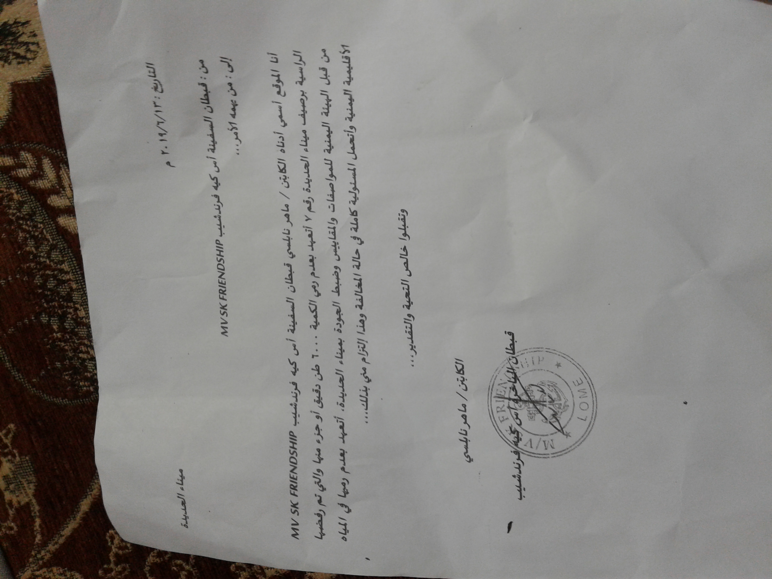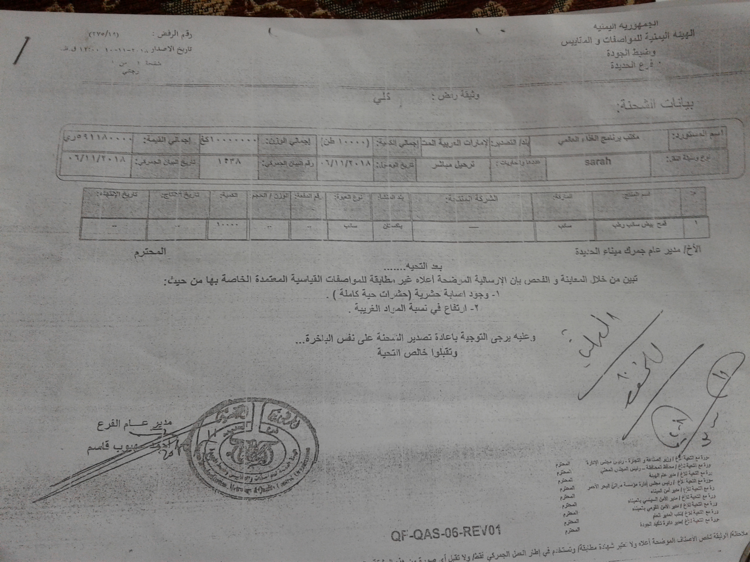 وفي منتصف مايو من العام الجاري ضبطت هيئة المواصفات الباخرة jette marit وعلي متنها اكثر من 136الف كيس قمح تتبع برنامج الغذاء العالمي واعادتها للبلد المصدر لوجود حشرات ميتة فيها وتلف الكمية.