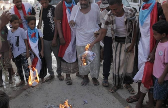 واضرم المتظاهرون النار بصور قيادات في المجلس الانتقالي الجنوبي الممول اماراتيا ووصفوهم باللصوص في خطوة هي الاولى من نوعها.