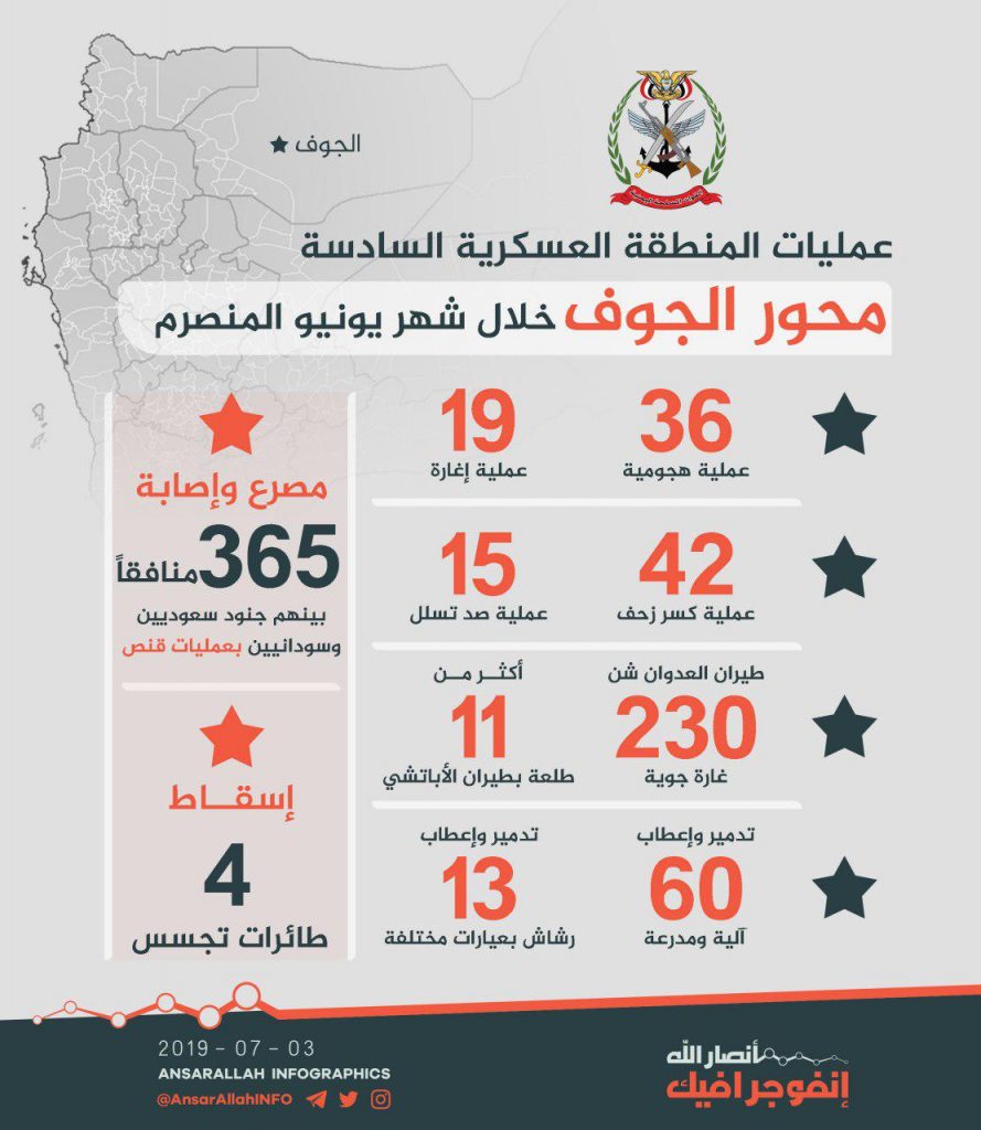 وقال مصدر عسكري، أن قوات الجيش واللجان الشعبية نفذت 36 عملية هجومية وأكثر من 19 عملية اغارة في مختلف محاور القتال بمحور الجوف، والجبهات الأخرى من جبهات المنطقة العسكرية السادسة.