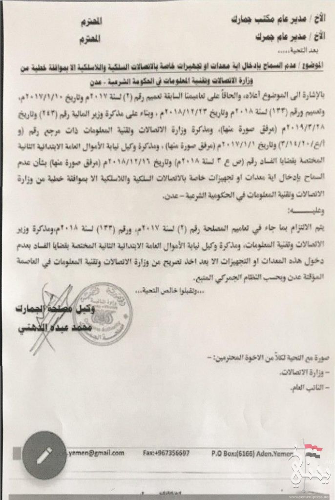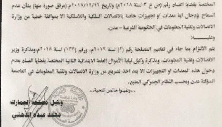 وكشفت وثيقة صادرة عن جمارك قوى العدوان، حصل عليها “يمني برس”،  بمنع دخول معدات شركات الاتصالات السلكية واللاسلكية الا بموافقة من مرتزقة تحالف قوى العدوان والاحتلال السعودي الامريكي.