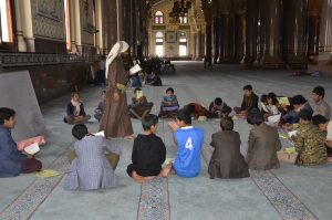 ما إن تطأ أقدامك ساحات المسجد وتتجاوز الأبواب حتى تنشف أذان مسامعك لصدى آيات القران الكريم التي يتجلل صداها في داخل المسجد وترتفع بتراتيلها وتجويدها حناجر المعلمين والتلاميذ على امتداد مساحة المسجد الواسعة والمترامية الأطراف.