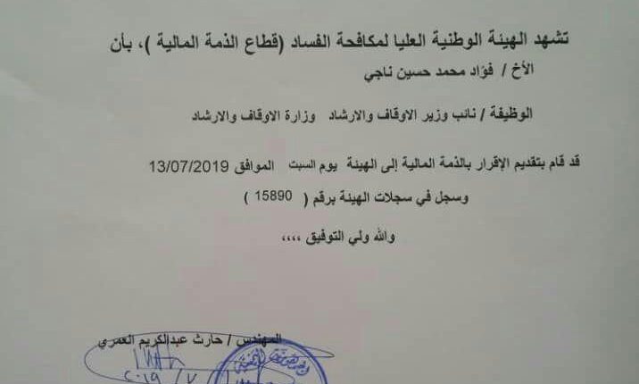 نائب وزير الاوقاف يقدم إقراره بالذمة المالية إلى مكافحة الفساد “وثيقة”