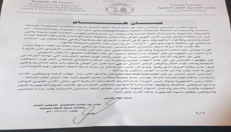 ورد الآن.. نقابات شركة النفط بـ”عدن” تصدر بياناً تتهم فيه هوامير الفساد والمتنفذين في حكومة الفار هادي بتدمير اقتصاد البلاد