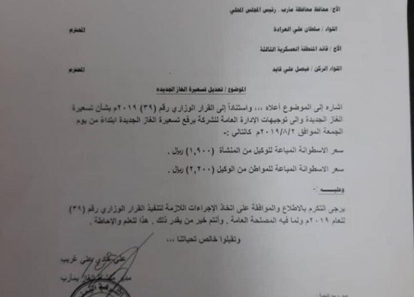 وذكرت الوثيقة التي وجهت من قبل ما يسمى بمدير منشأة شركة الغاز بمارب المرتزق “علي هادي غريب” إلى ما يسمى محافظ مأرب المرتزق سلطان العرادة أن إدارة شركة الغاز استندت في رفعها سعر الغاز إلى أسمته القرار الوزاري “لحكومة الفار هادي الموالية للرياض” رقم 39 من العام 2019 بشأن تسعيرة الغاز الجديدة.