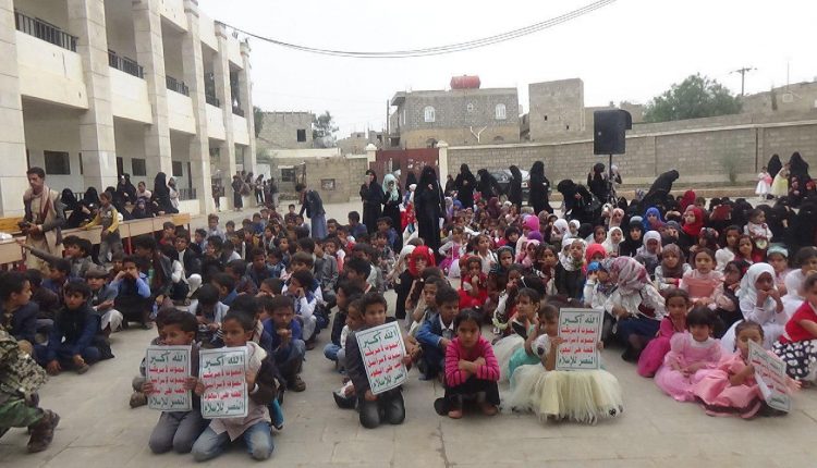 المسيرة وعلى رسومات معبرة للطلاب والطالبات وتحف جميلة صنعتها طالبات المركز.