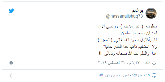 وشدد مجددا على عدم إمكانيته التأكد من هذه المعلومة في تغريدة أخرى قال فيها: ”مازلت أكرر المعلومة غير مؤكدة وفي انتظار ماسيتم الاعلان عنه صدق ام مجرد اشاعة”