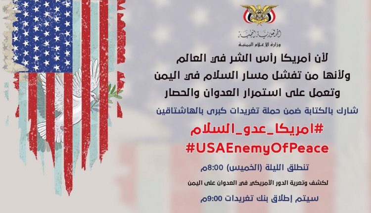 واعلنت #وزارة_الإعلام اليوم عن اطلاق حملة تغريدات لكشف الدور الأمريكي في العدوان على اليمن تحت شعار ” #أمريكا_عدوة_السلام ” وتعرية الدور الأمريكي في عرقلة تحقيق السلام في اليمن.