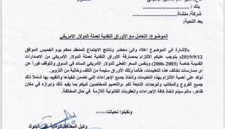 وأكد التعميم على كافة البنوك التجارية وشركات ومنشآت الصرافة مصارفة الأوراق النقدية القديمة بنفس السعر الفعلي السائد للدولار الامريكي في السوق، والتوقف فوراً عن أية ممارسات تخالف هذه التعليمات.