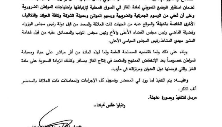 وجاء توجيه وزارة المالية، تنفيذاً لما نص عليه المحضر الرئاسي الخامس، الخاص بتوفير مادة الغاز المنزلي، والذي قضى منطوقة بالسماح باستمرار الاستيراد لشحنات الغاز المنزلي بشكل دائم ومستمر، وبدون التقيد بكمية محددة لضمان استقرار الوضع التمويني.