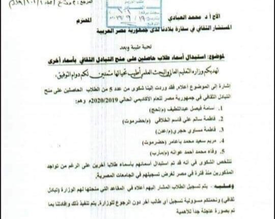 امتد فساد سفير حكومة الفار هادي، في الجمهورية المصرية، “محمد مارم” ليطال طالبة متفوقة من ضمن اوائل الجمهورية .