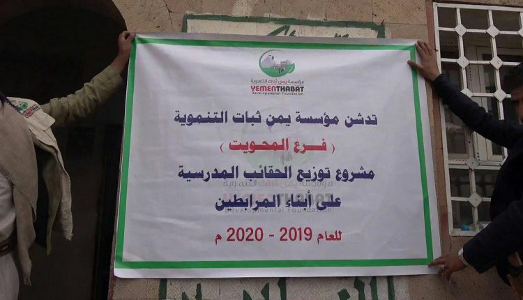 مؤسسة يمن ثبات بالمحويت تدشن توزيع الحقيبة المدرسية لأبناء المرابطين