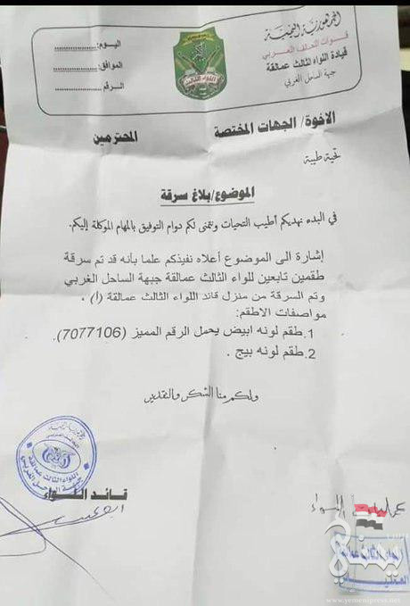 وحصل “يمني برس” على وثيقة بلاغ سرقة صادرة عن قيادة ما يسمى باللواء الثالث عمالقة تكشف عن سرقة طقمين تابعين لها من منزل قائد اللواء الثالث (أ).
