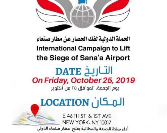 تنظم الجالية اليمنية وقفة احتجاجية غدا أمام مقر الأمم المتحدة في نيويورك، للمطالبة بفتح مطار صنعاء الدولي وإنقاذ حياة الآلاف من المرضى.