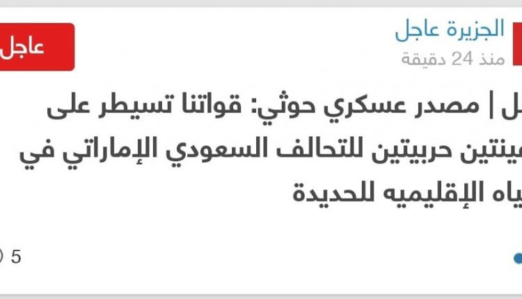 نقلت قناة “الجزيرة” القطرية عن ماوصفته بمصدر عسكري حوثي قبل قليل من مساء اليوم أن القوات اليمنية تمكنت من السيطرة على سفينتين حربيتين للتحالف السعودي الإماراتي في المياه الإقليمية اليمنية في الحديدة.