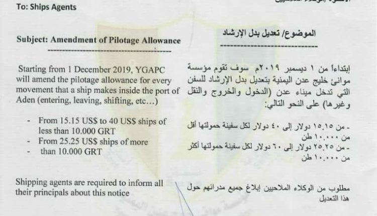 أعلنت مؤسسة موانئ خليج عدن اليمنية، بتاريخ 18-نوفمبر-2019م، عن زيادة سعرية في رسوم إرشاد السفن التي تدخل الميناء (الدخول والخروج والنقل وغيرها) على النحو التالي: