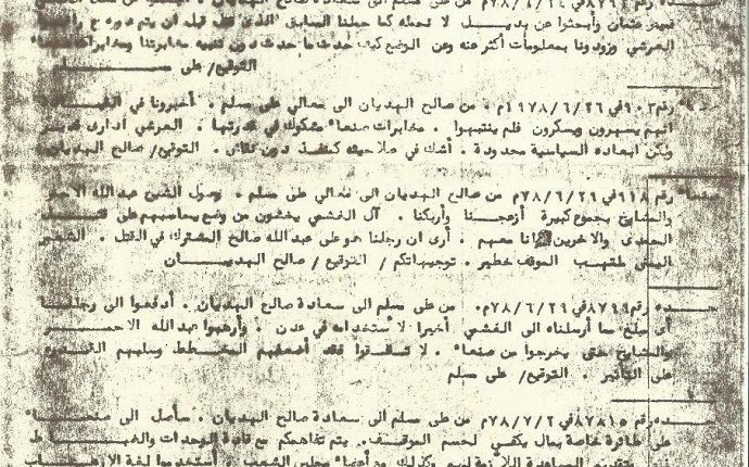 ـ من صالح الهديان إلى معالي علي مسلم اخبرونا في القيادة انهم يسهرون ويسكرون فلم ينتبهوا, مخابرات صنعاء مشكوك في قدرتها, العرشي اداري ولكن ابعاده السياسية محدودة, اشك في صلاحيته كمنفذ دون نقاش.