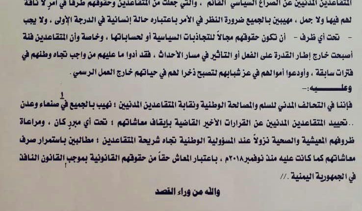 وطالب باستمرار صرف معاشاتهم كما كانت عليه منذ نوفمبر 2018م، باعتبارها حق من حقوقهم القانونية بموجب القانون النافذ في الجمهورية اليمنية.