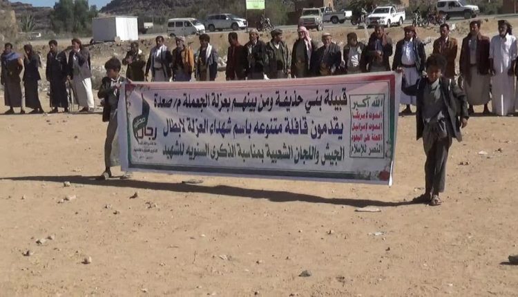 وخلال تسيير القافلة نظم الحاضرون وقفة قبلية مسلحة تنديدا بجرائم العدوان ، وتأكيدا على مواصلة الصمود في طريق الشهداء .