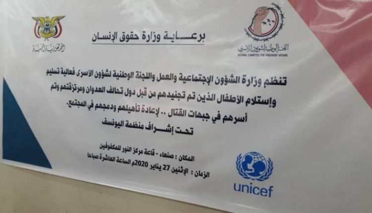 سلمت اللجنة الوطنية لشؤون الأسرى تسلم 64 طفلا أسروا في جبهات القتال جندتهم قوى العدوان إلى وزارة الشئون الاجتماعية لإعادة إدماجهم بالمجتمع تحت إشراف منظمة الأمم المتحدة للطفولة “اليونيسف”.