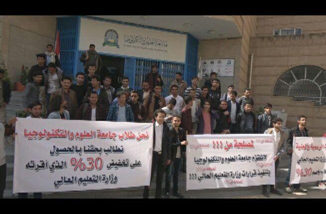 نظم طلاب جامعة العلوم والتكنولوجيا اليوم وقفة إحتجاجية في ساحة الجامعة لمطالبة رئاسة الجامعة بتطبيق قرار وزارة التعليم العالي تخفيض نسبة الرسوم الدراسية للطلاب بواقع 30%، وإعتماد سعر صرف البنك المركزي اليمني في صنعاء 250 ريال للدولار.