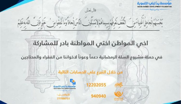 مؤسسة “يد تبني” تطلق مشروع السلة الرمضانية وتدعو الجميع للمساهمة