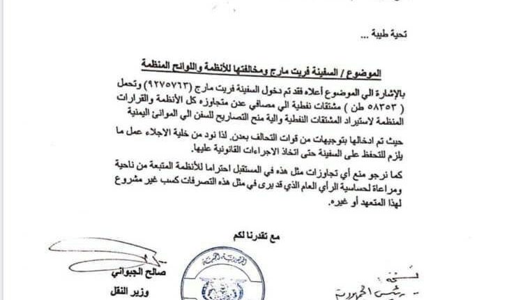 وكانت مذكرة سابقة صادرة عن ما يسمى قوات التحالف وجهت مدير ميناء الزيت بعدن باعتماد ادخال السفينة إلى الرصيف 4 عاجلا.