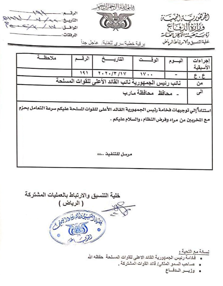 يوماً بعد يوم تزداد إنكشاف حقيقة حزب الإصلاح -فرع التنظيم العالمي للإخوان- في الجمهورية اليمنية، إذ كشفت وثيقة مسربة بتاريخ الثلاثاء 17 مارس 2020م توجيه الجنرال المجرم علي محسن الأحمر نائب الفار هادي للقيادي في حزب الإصلاح سلطان العرادة، المعين من قبل العدوان محافظاً لمأرب، بشن الحرب على قبائل مراد بمحافظة مأرب.