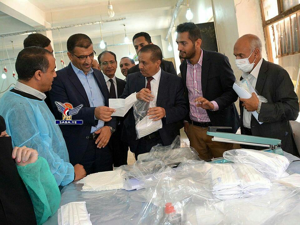 أطلع وزيرا الصناعة والتجارة عبد الوهاب يحيى الدرة والاتصالات وتقنية المعلومات مسفر عبد الله النمير خلال زيارتهما اليوم لمصنع الغزل والنسيج بصنعاء على سير عملية إنتاج الكمامات الطبية والملابس الطبية.
