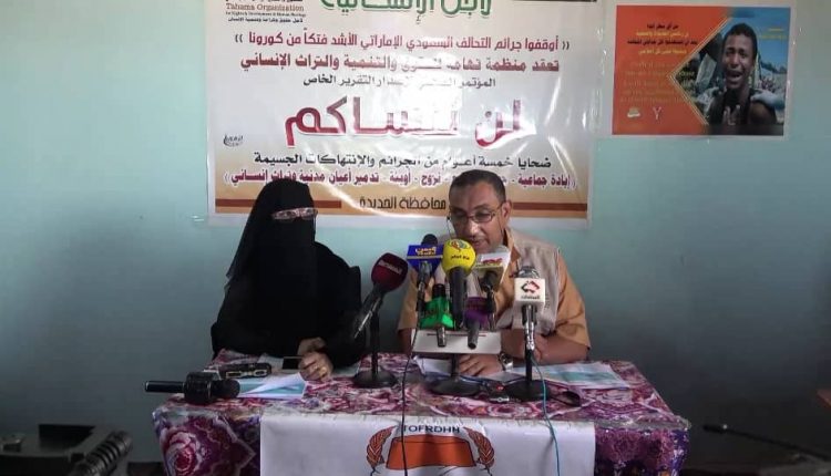 عقد بمحافظة الحديدة اليوم مؤتمر صحفي حول الوضع الإنساني بالمحافظة والجرائم والانتهاكات التي ارتكبها تحالف العدوان والمرتزقة على مدى خمس سنوات، نظمته منظمة تهامة للحقوق والتنمية والتراث الإنساني.