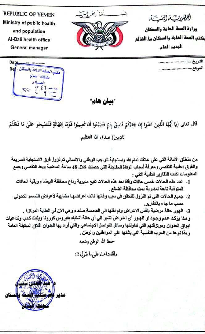 الكشف رسمياً عن أسباب وفاة خمسة أشخاص بشكل مفاجئ وحقيقة وجود حالات كورونا بالضالع