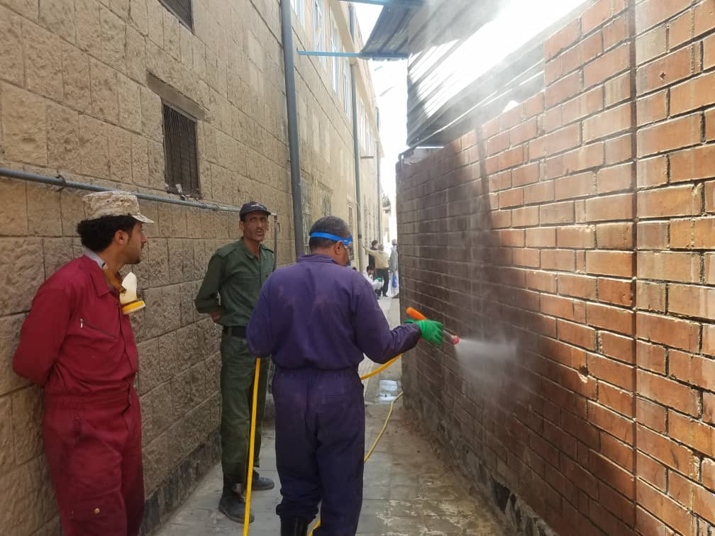 ونفذت الفرق الميدانية لحماية البيئة حملة الرش والتعقيم في الأسواق والمستشفيات والمراكز الطبية والشوارع بمديرية معين .