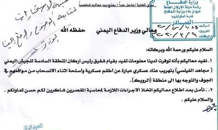 كشفت وثيقة عسكرية سرية صادرة عن قائد قوات تحالف العدوان في مأرب وموجهة إلۑ وزير دفاع حكومة الفار هادي عن قيام قيادات في المرتزقة بنهب أسلحة وأطقم للتحالف بمحافظة الجوف.