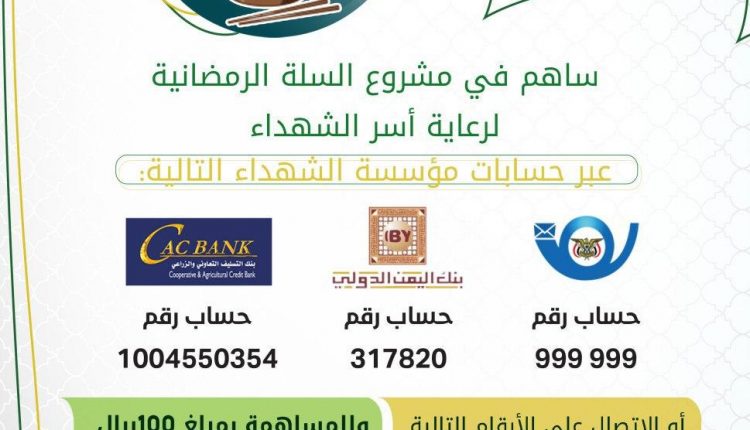 وفي تعميم تحت عنوان “هل جزاء الإحسان إلا الإحسان” دعت المؤسسة إلى المشاركة والمساهمة في مشروع السلة الرمضانية لأسر الشهداء عبر الحسابات التالية: