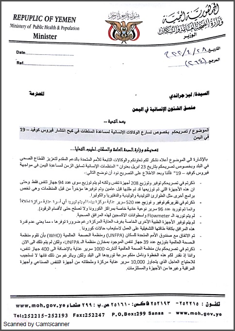 بالإشارة إلى الموضوع أعلاه نشكر لكم تعاونكم والوكالات التابعة للأمم المتحدة بالدعم المقدم لتعزيز القطاع الصحي في البلد وبخصوص تصريحكم بتاريخ 23 أبريل بعنوان ” المنظمات الإنسانية تسابق الزمن لمساعدة اليمن في مواجهة فيروس كوفيد -19 فإننا وبعد الاطلاع على التصريح نود أن نوضح التالي: