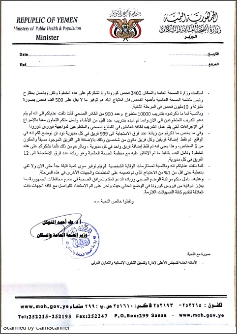 وعليه: نأمل منكم مواكبة الوضع الصحي وزيادة الدعم المقدم للمرافق الصحية في جميع محافظات الجمهورية بما يعزز الوقاية من فيروس كورونا في الوضع الحالي حيث ونحن على أتم الاستعداد للتواصل مع كافة الجهات ذات العلاقة لتقديم كافة التسهيلات اللازمة.