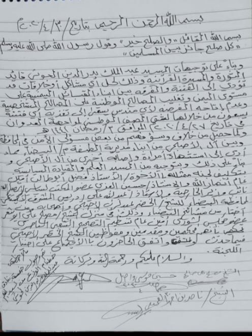 اللجنة المكلفة من قبل قائد الثورة بحل مشكلة مقتل امرأة في البيضاء تصدر بياناً عن آخر المستجدات