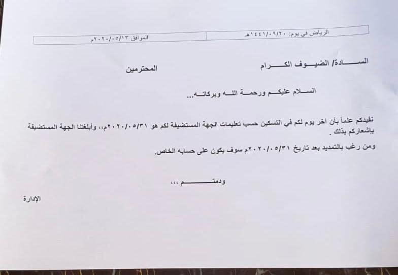 كشف إشعار وجهته السلطات السعودية لقيادات المرتزقة في حكومة الفار هادي بإخلاء المساكن التي يقيمون فيها بفنادق الرياض، وعدم تجديد السكن لكافة مسؤولي المرتزقة التي كانت مخصصة لهم، بعد تاريخ 31 مايو كحد أقصى.