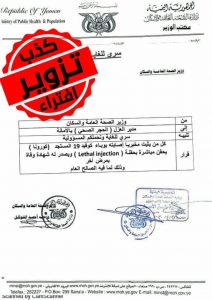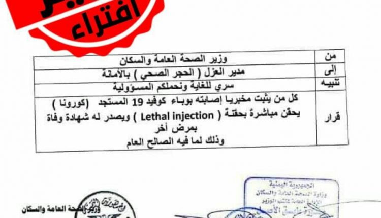تداول عدد من الناشطين والمفسبكين ما قامت بنشره عدد من المواقع التابعة لتحالف العدوان ومرتزقته بأن وزارة الصحة العامة والسكان اصدرت مذكرة تحت عنوان (سري للغاية) وفيها توجيه ل(مدير الحجر الصحي بالعاصمة بقتل كل من يتضح اصابته بفيروس كورونا بإبرة خاصة بذلك) وهذا كلام عاري تماما من الصحة والمصداقية وليس اكثر من مجرد ورقة تم تزويرها من قبل الأدوات القذرة الخبيثة التابعة لتحالف العدوان الامريكي السعودي الصهيوني على اليمن امتدادا لما قاموا به من إفك وبهتان خلال أكثر من خمسة سنوات من العدوان والحصار على الشعب اليمني .