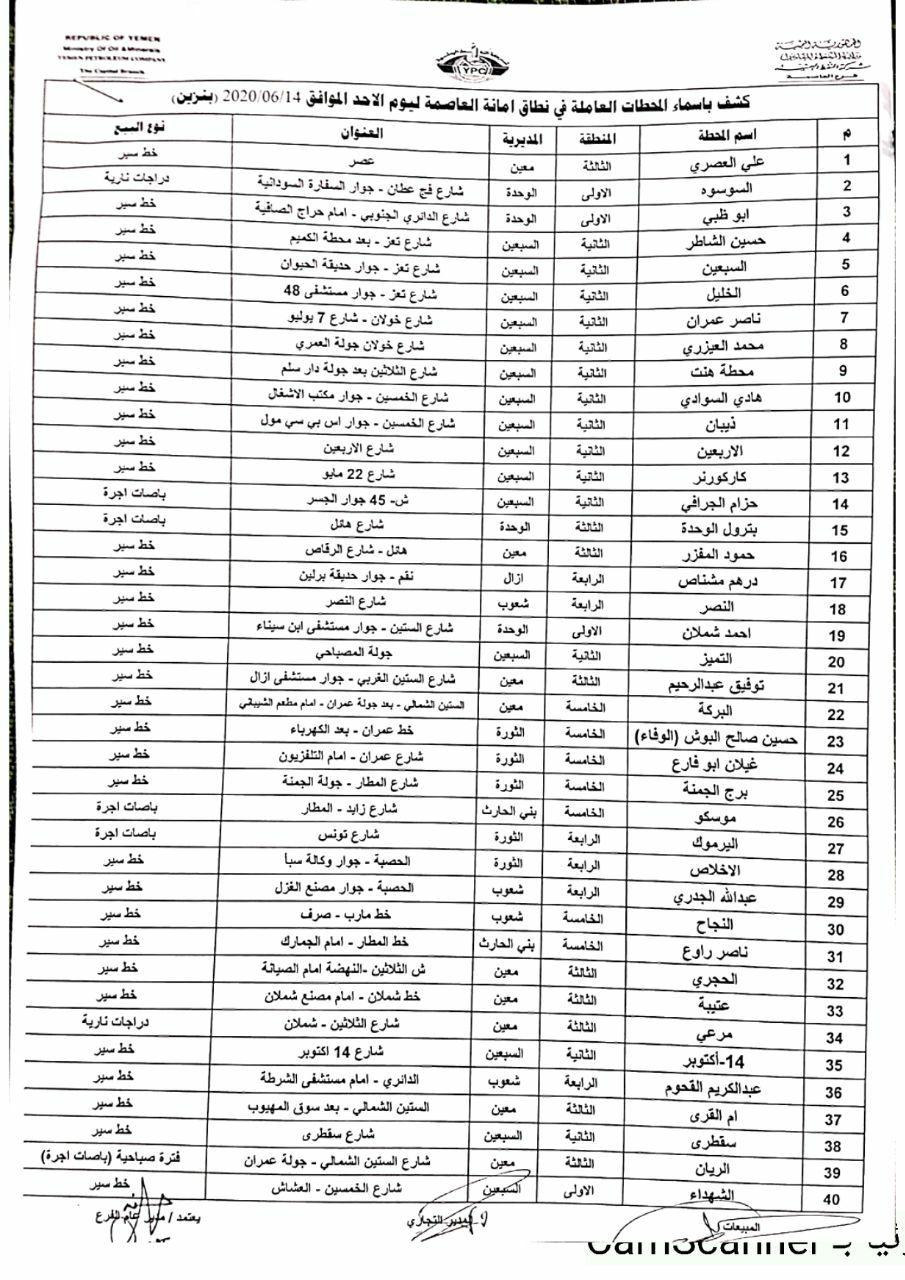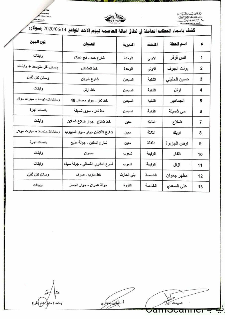 كشوفات بـ أسماء المحطات العاملة في أمانة العاصمة ليوم الأحد الموافق 14 يونيو 2020م