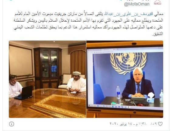 وقالت وزارة الخارجية العمانية على حسابها في “تويتر”، إن غريفيث شكر، خلال الاتصال الافتراضي مع بن علوي، السلطنة على دعمها المتواصل لهذه الجهود، فيما لم تورد الوزارة تفاصيل ما دار في اللقاء.