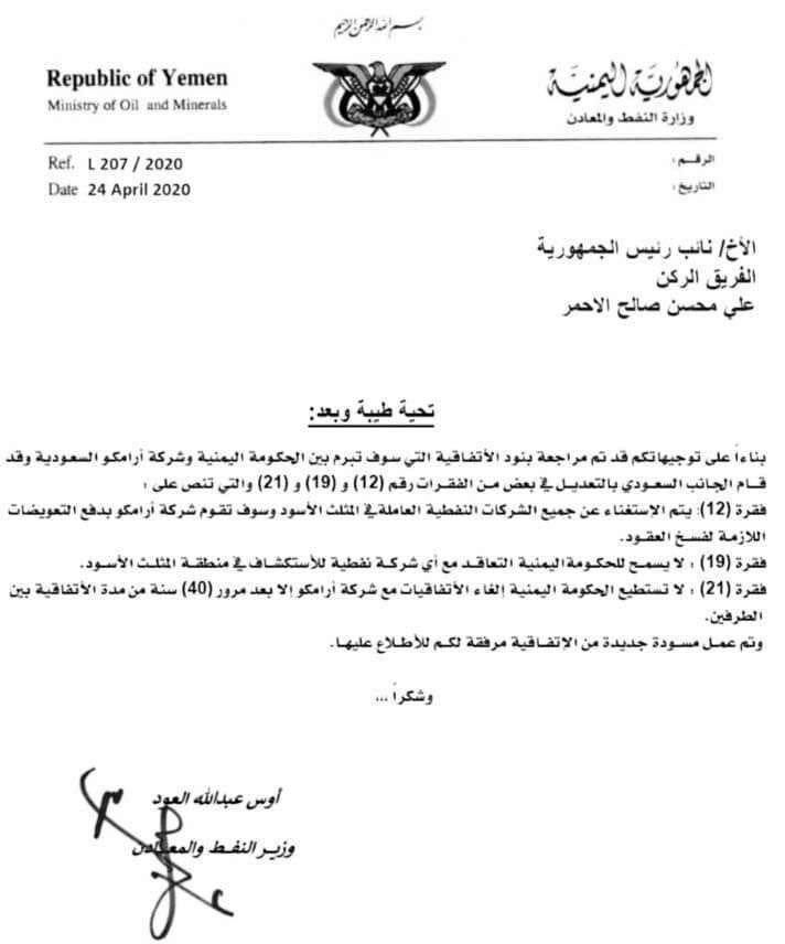 الوثيقة المسربة التي نشرها موقع “المساء برس” تحمل توقيع وزير النفط بحكومة المرتزقة، موجهة لنائب الفار هادي، الجنرال العميل علي محسن الأحمر، تتضمن إبلاغه بالتعديلات التي أجراها الجانب السعودية “على بنود الاتفاقية التي سوف تبرم بين حكومة المرتزقة وشركة أرامكو.