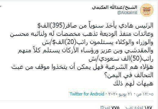 وقال العكيمي في تغريده له أن رواتب الوزراء والوكلاء المحسوبون على حكومة هادي تبلغ شهرياً (20) الف دولار.