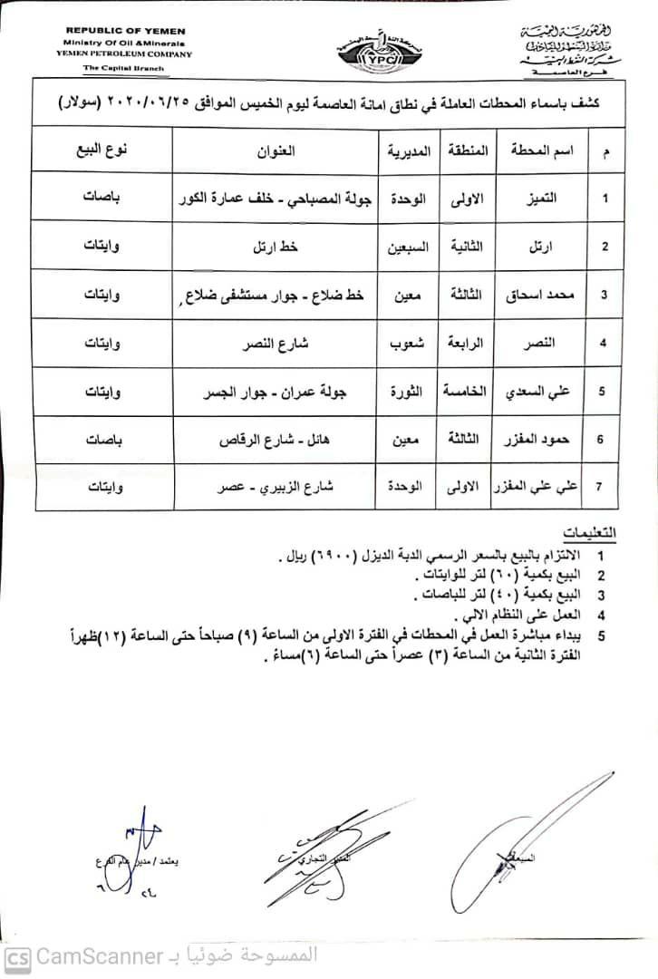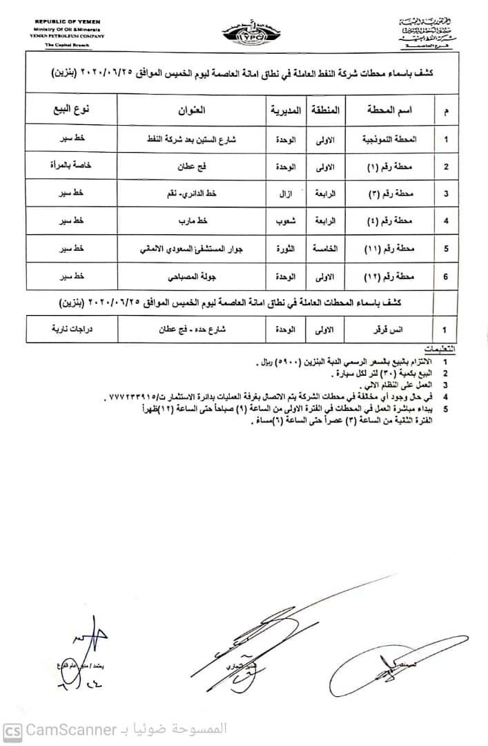 كشوفات بـ أسماء المحطات العاملة في العاصمة صنعاء (بنزين + ديزل) ليوم الخميس 25 يونيو 2020م