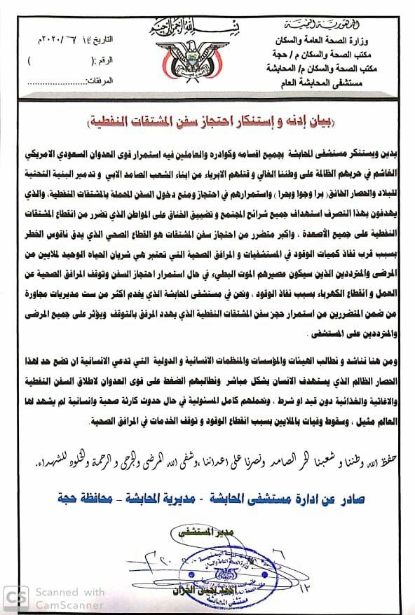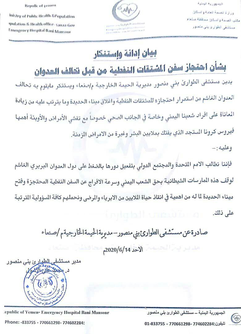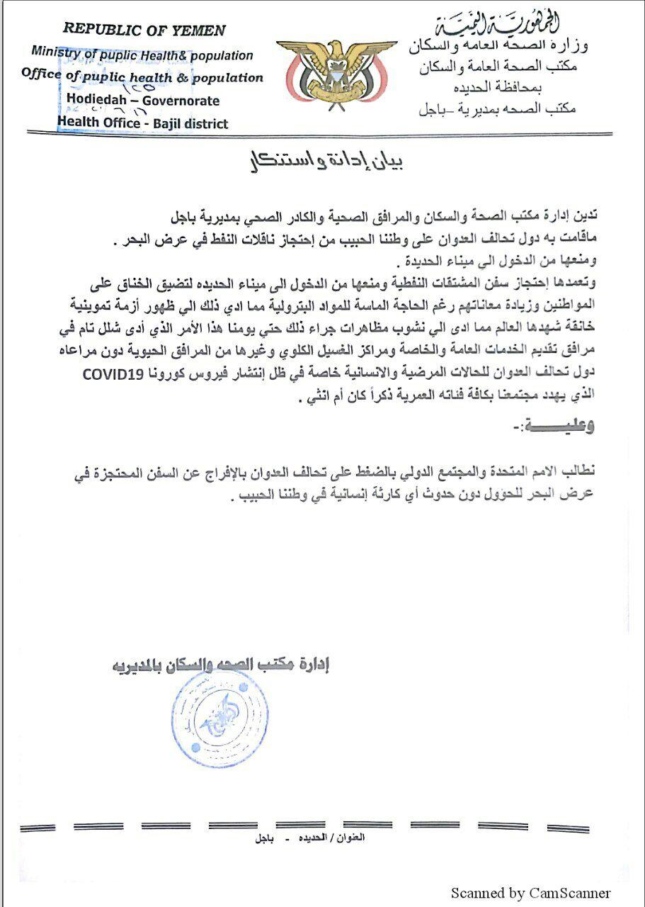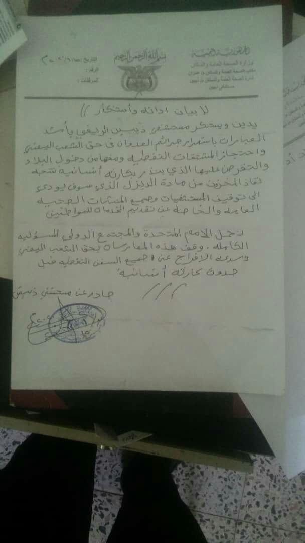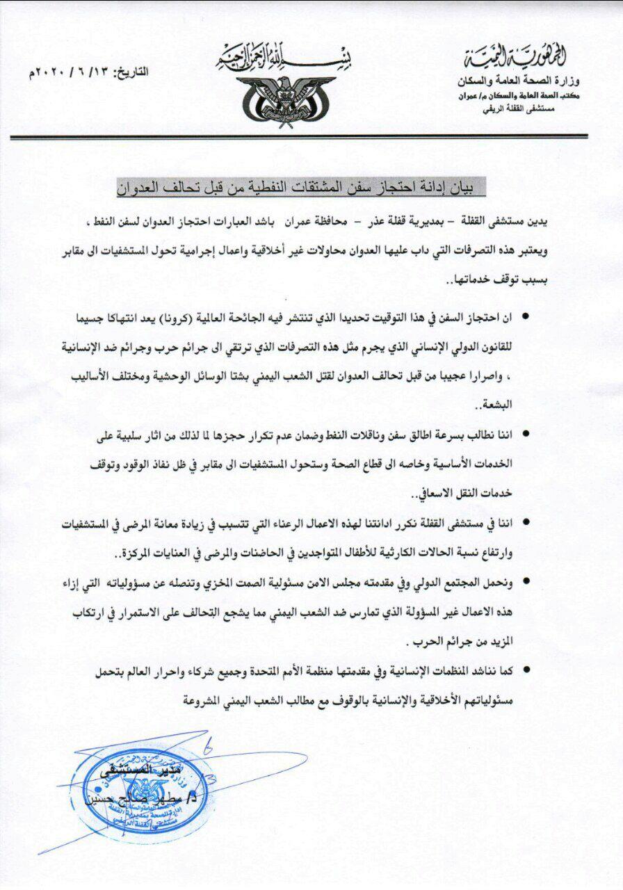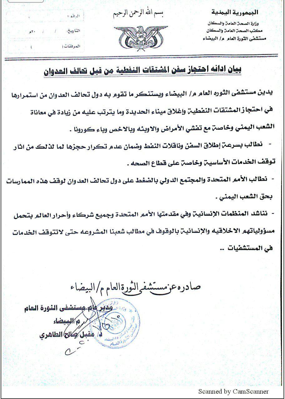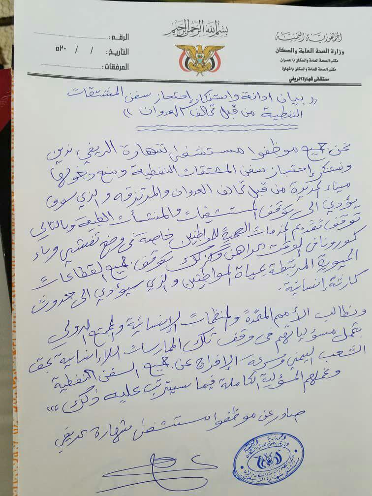 ونشرت الوزارة أسماء بعض من هذه المستشفيات والمحافظات ومكاتب الصحة التي أصدرت بيانات الإدانة والإستنكار لإحتجاز تحالف العدوان سفن المشتقات النفطية وهي كالتالي :-