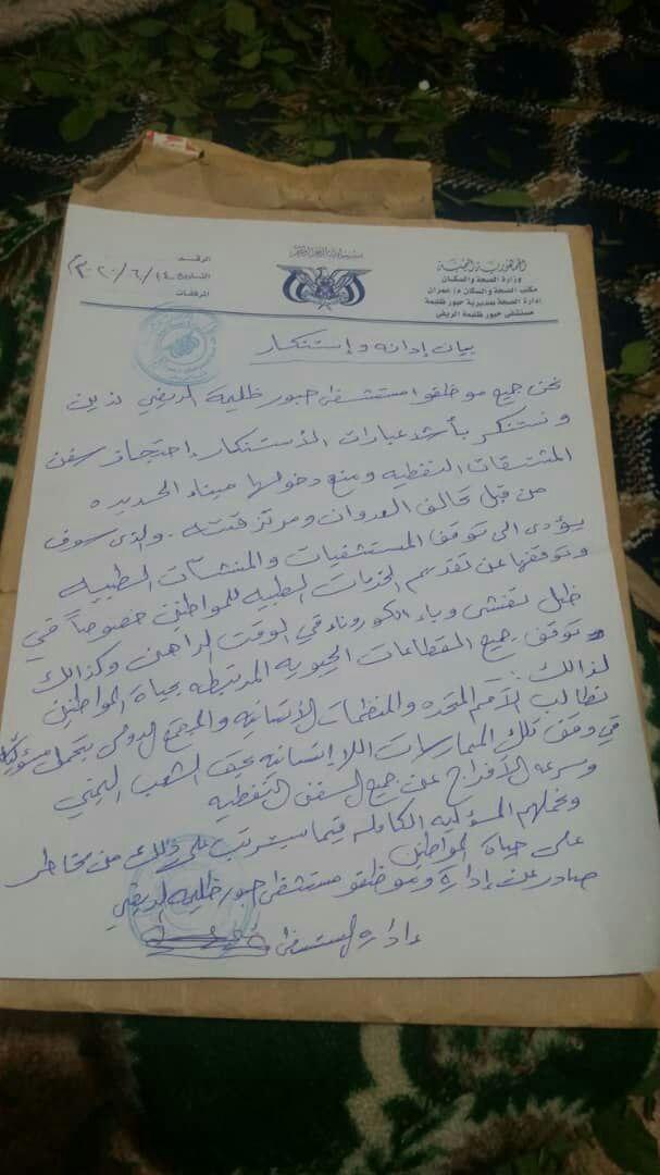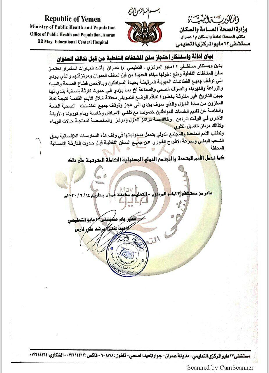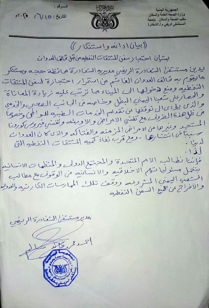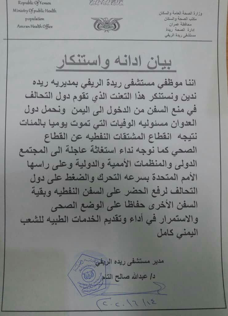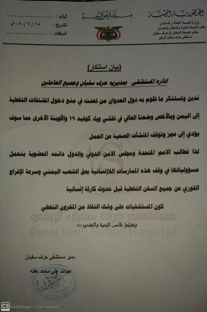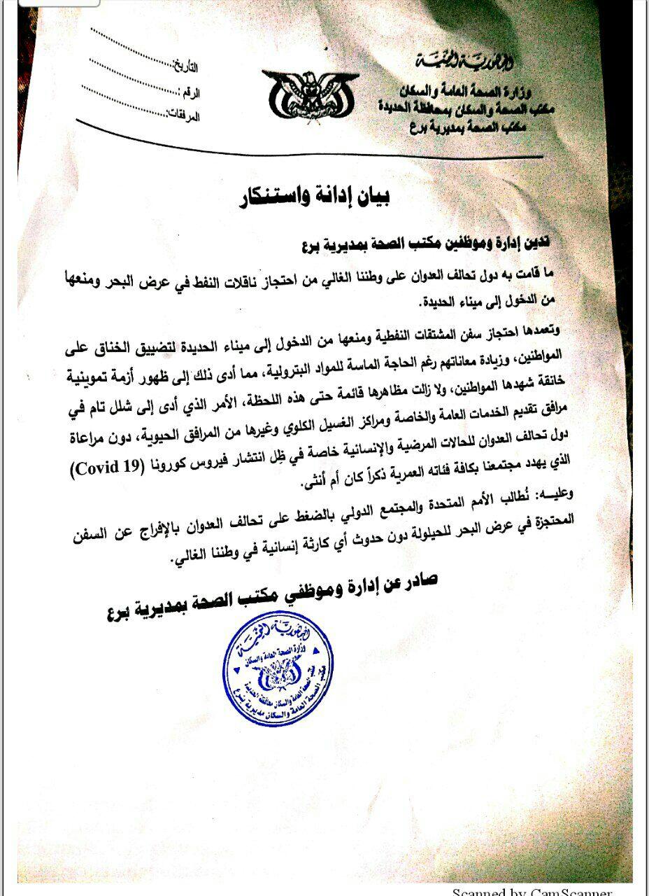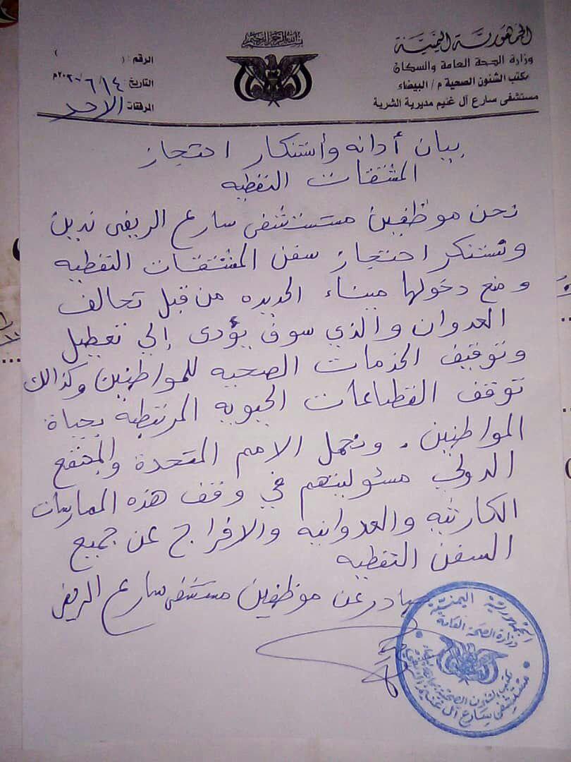 ونشرت الوزارة أسماء بعض من هذه المستشفيات والمحافظات ومكاتب الصحة التي أصدرت بيانات الإدانة والإستنكار لإحتجاز تحالف العدوان سفن المشتقات النفطية وهي كالتالي :-