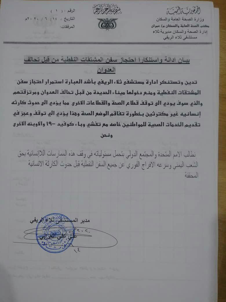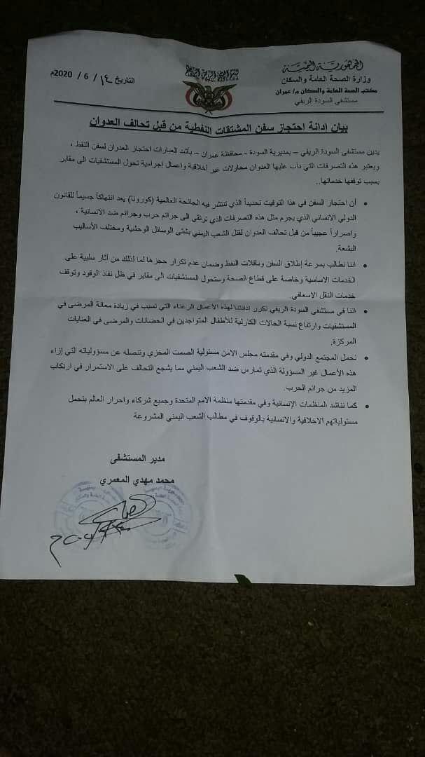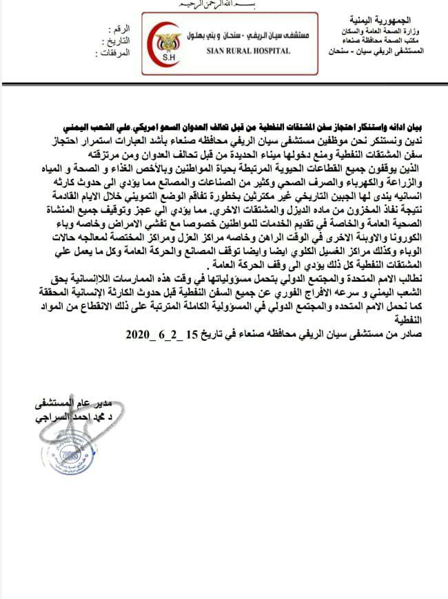 قالت وزارة الصحة العامة والسكان في صنعاء، إنها تلقت عدداً من بيانات الإدانة والإستنكار من عدد من المستشفيات ومكاتب الصحة في اليمن وذلك لاستمرار دول تحالف العدوان السعودي الأمريكي بإحتجاز سفن المشتقات النفطية وقرب نفاذ الكميات التي تمتلكها والذي سيتسبب بكارثة إنسانية.