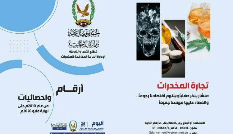 وتحتفي الجمهورية اليمنية وسائر دول العالم في الـ 26 من يونيو من كل عام باليوم العالمي لمكافحة المخدرات بهدف زيادة الوعي بالمشكلة الرئيسية التي تمثلها المخدرات على المجتمع.