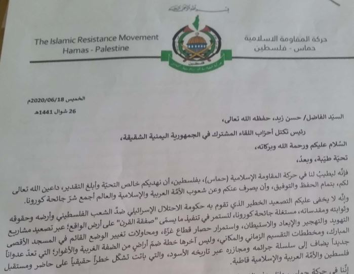 رحب اللقاء المشترك في اجتماعه المنعقد اليوم الخميس برسالة رئيس المكتب السياسي في حركة المقاومة الإسلامية الفلسطينية “حماس” إسماعيل هنية التي بعثها الخميس الموافق 18 يونيو 2020م إلى الأستاذ حسن زيد الرئيس الدوري لتكتل اللقاء المشترك حول التصعيد الخطير الذي يقوم به كيان الاحتلال ضد الشعب الفلسطيني وأرضه وحقوقه ومقدساته من خلال مؤامرة ما تسمى صفقة القرن التي يراد لها أن تنفذ على أرض الواقع عبر تصعيد مشاريع التهويد والتهجير والاستيطان وكذا مخطط ضم أراض من الضفة الغربية والأغوار.