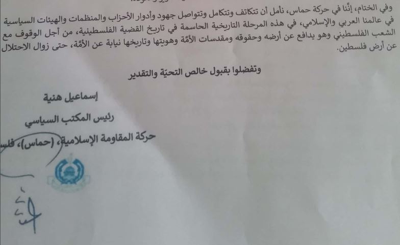 وأوضح هنية في رسالته أنه إزاء هذه الانتهاكات الجسيمة التي يمارسها العدو الإسرائيلي والمشاريع الخطيرة التي يسعى لتنفذيها ضد الأرض الفلسطينية وانطلاقا من الدور والمسؤولية التي تضطلع بها الأحزاب والمنظمات والهيئات السياسية تؤكد حركة حماس أهمية أن تتبنى الأحزاب في العالم العربي والإسلامي تحركا عاجلا لمواجهة سياسة الضم الاجرامية والعنصرية.